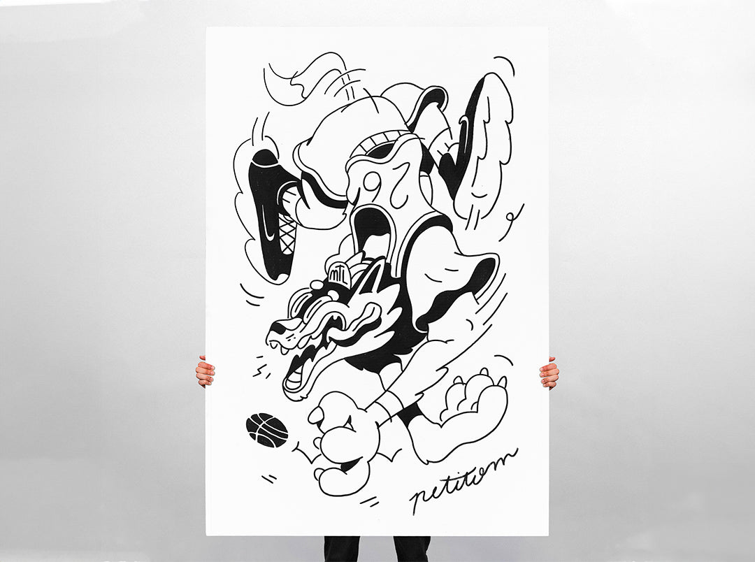 Le surnom "Petitom", en hommage à Mowgli, le "petit homme" du Livre de la Jungle, incarne la simplicité et la liberté propre au travail de l'artiste. Sa jungle picturale abrite une variété d'animaux couplés à leurs connotations qui enrichissent son univers. Ses représentations humaines qu’en à elles sont souvent comiques, permettant ainsi de réfléchir et de rire des imperfections de notre espèce.