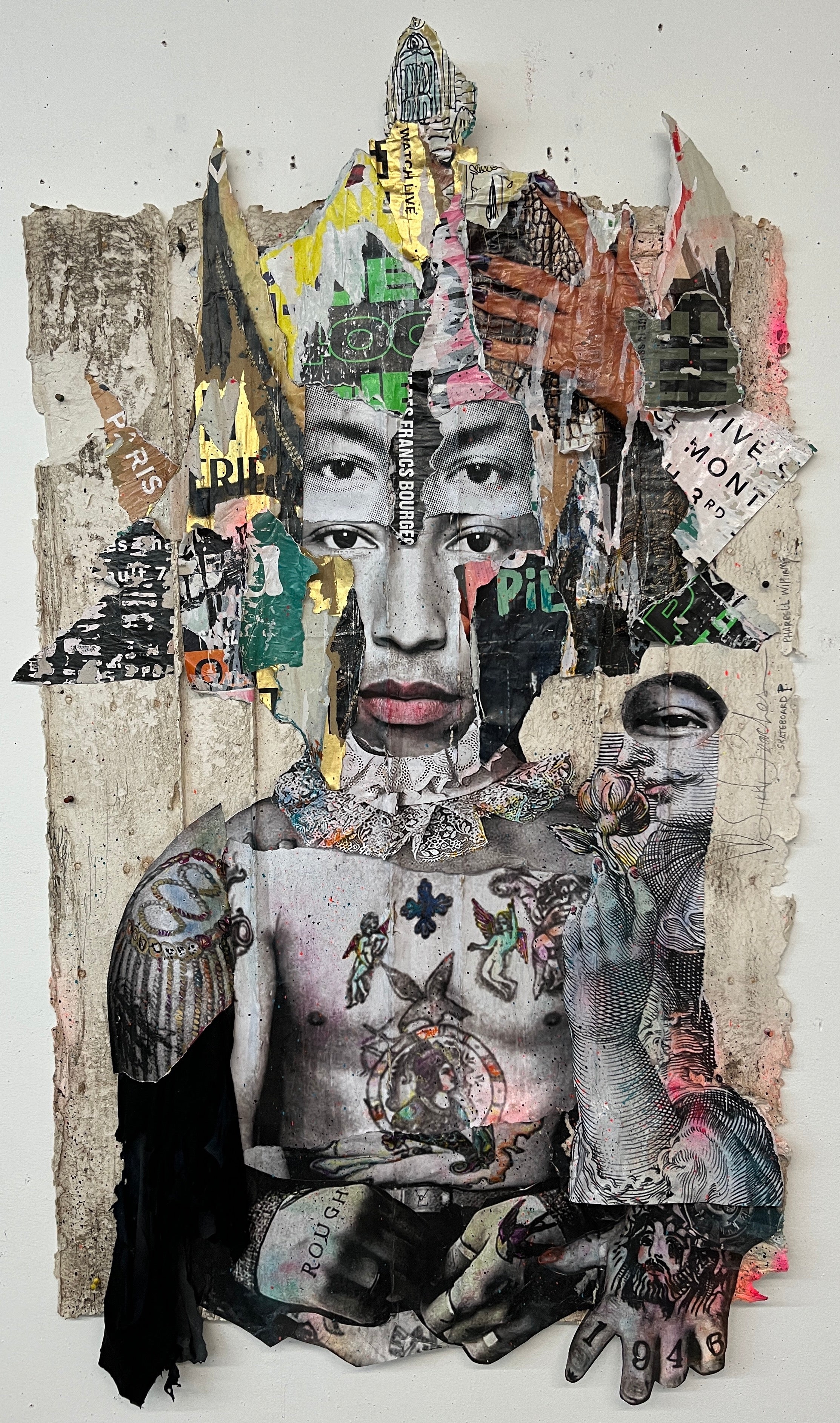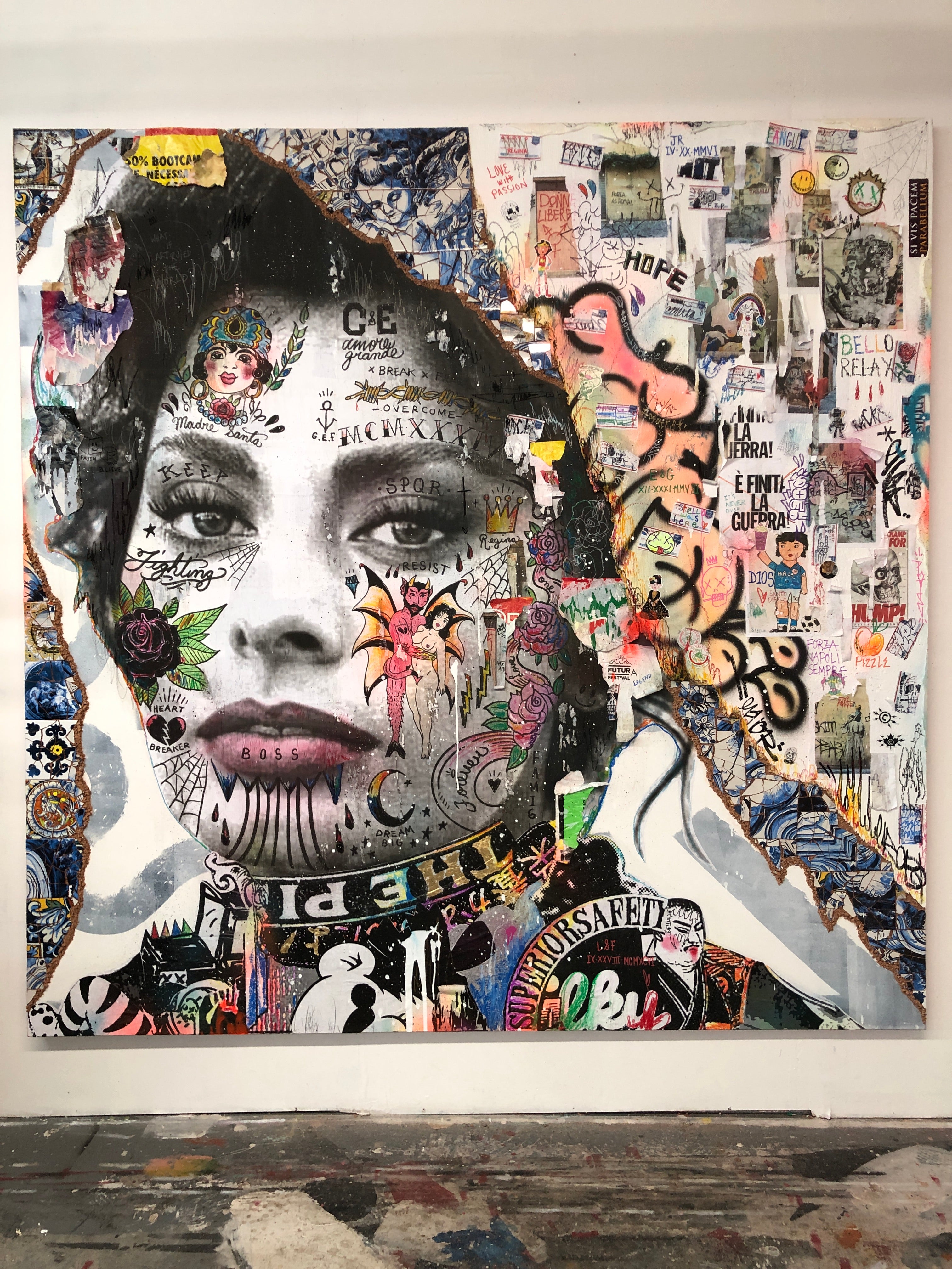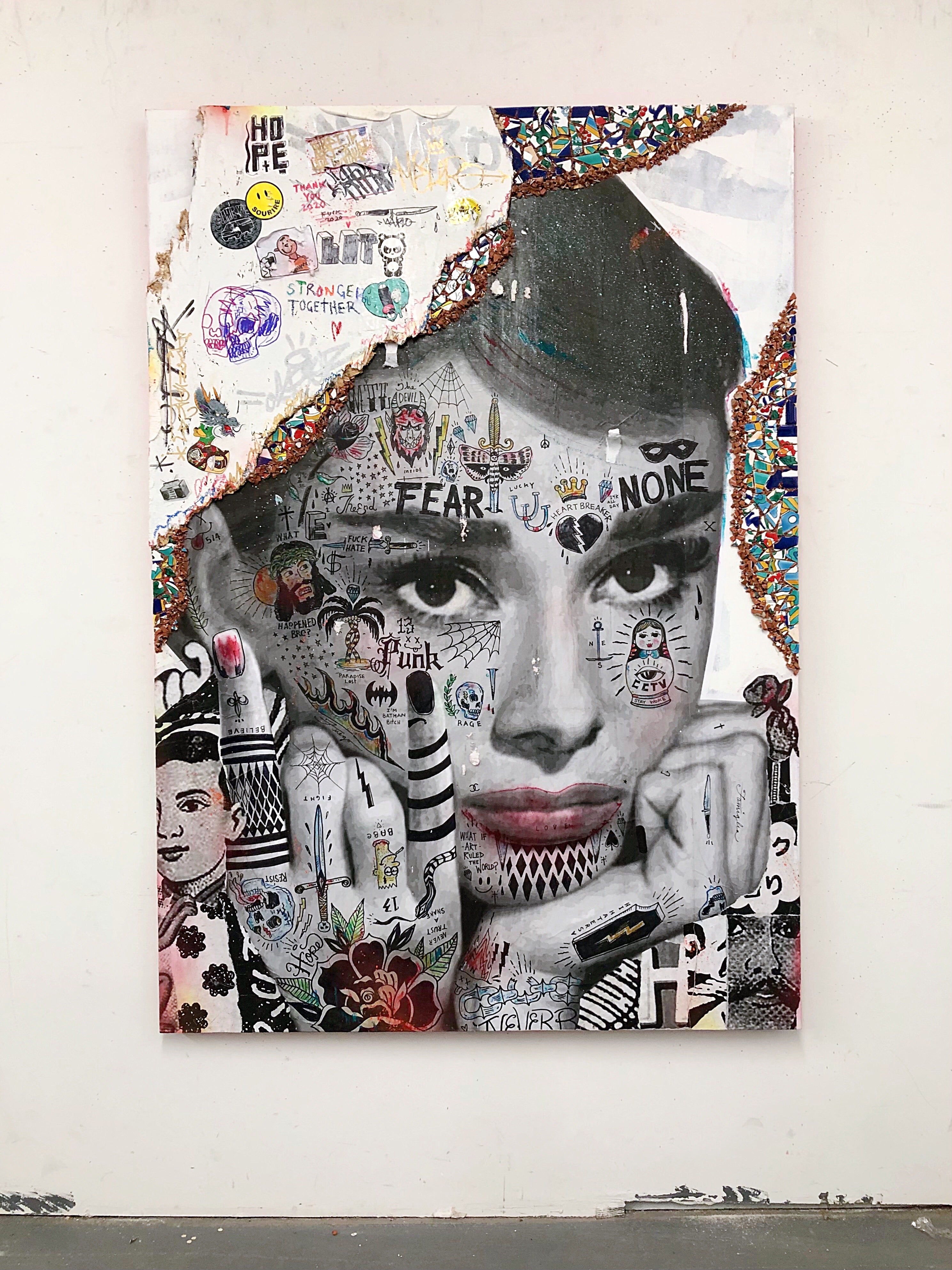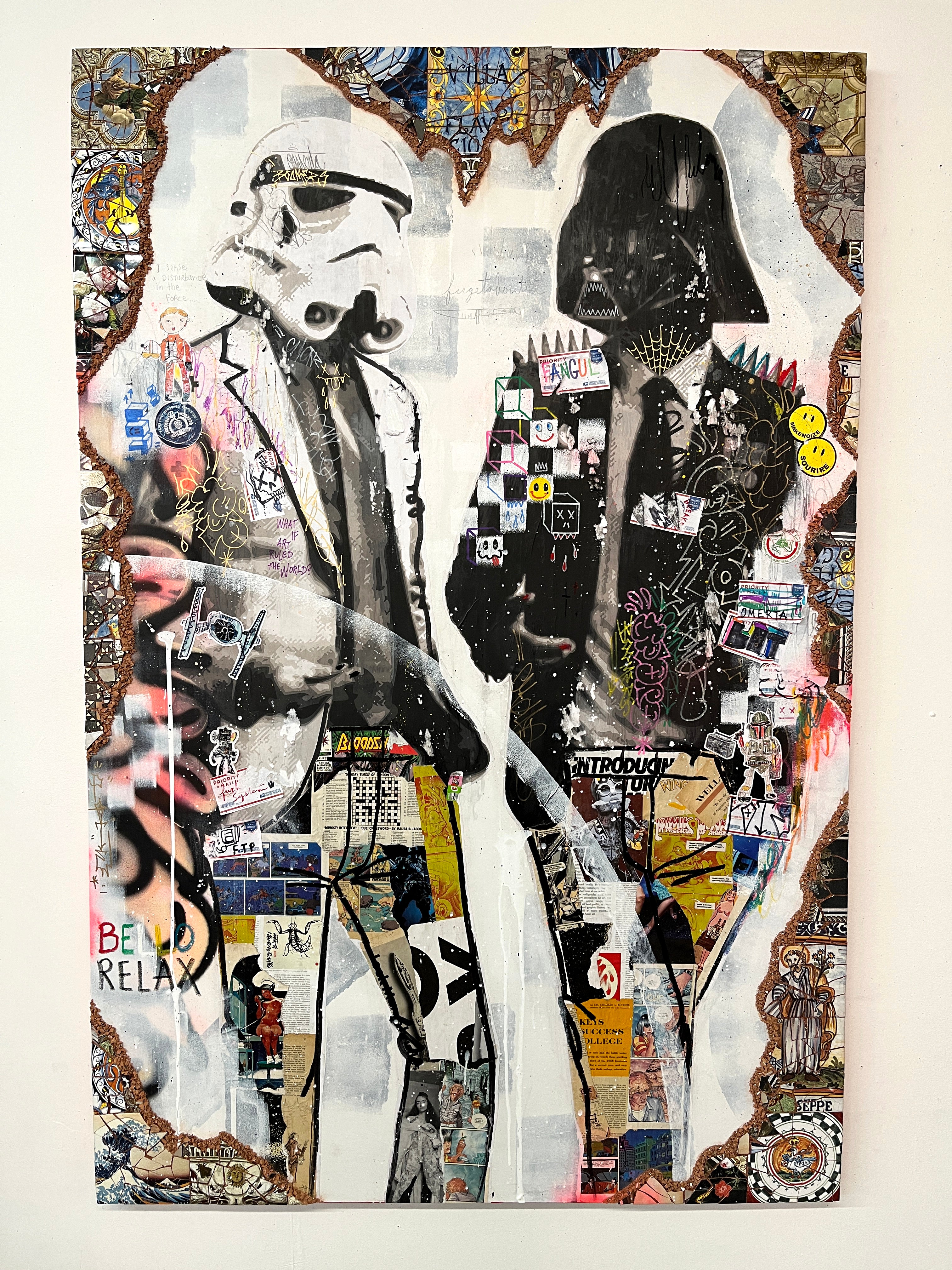 Ses créations, des portraits plus grands que nature de célébrités à des assemblages fantasques de figures iconiques, insufflent nostalgie et merveille, touchant universellement son audience. L'art de Stikki Peaches s'ancre dans la philosophie du réemploi, orchestrant un chaos visuel maîtrisé grâce à une fusion de techniques diverses. Cette approche, alliant superposition et mixité, confère à son œuvre une richesse texturale et une profondeur invitant à la réflexion sur l'entrelacement de l'art, des médias et de la société.