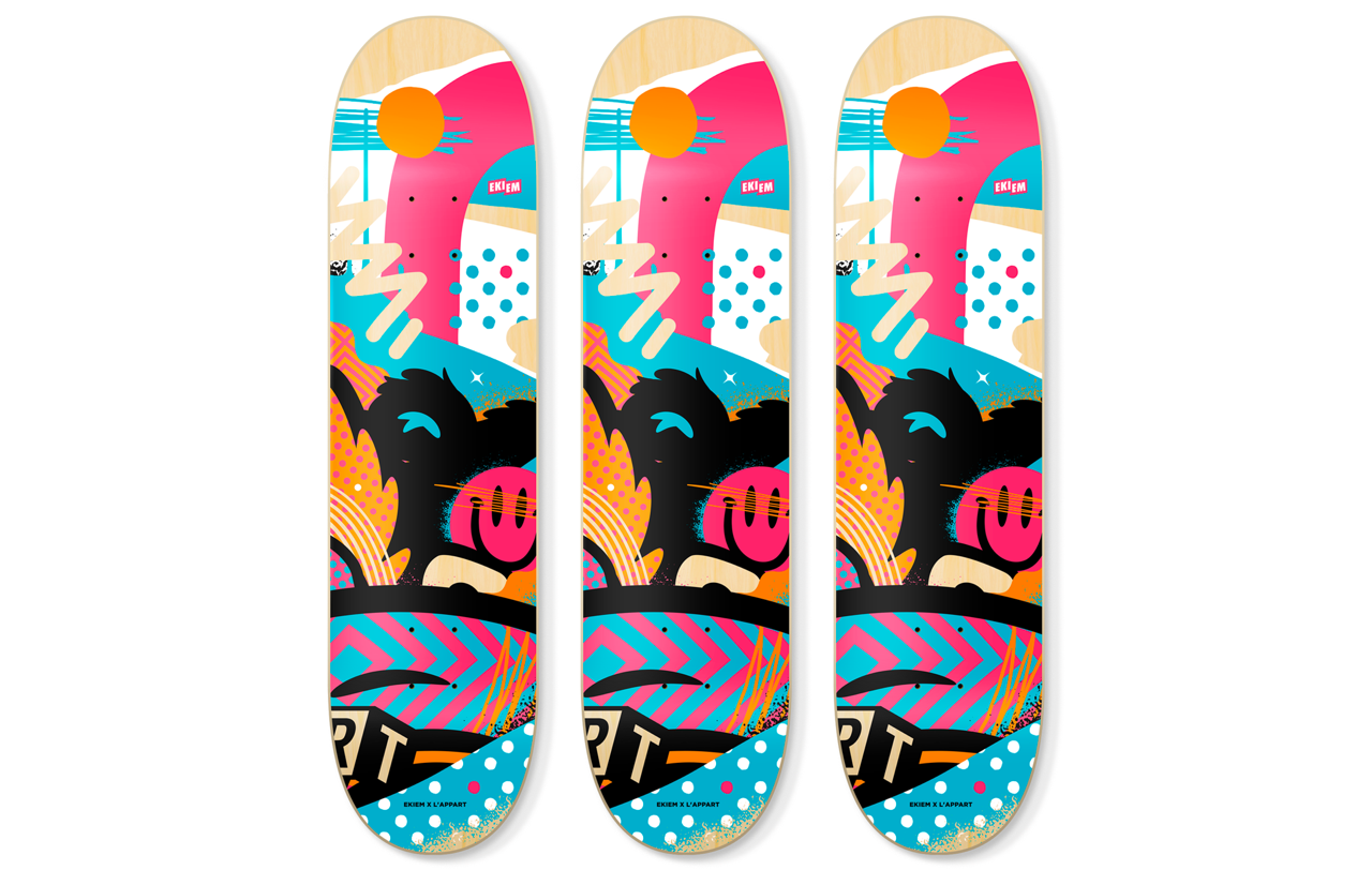 Parallèlement à son activité de designer, Julien Ekiem développe un style plus personnel et adopte dans ses œuvres un langage visuel simple à base de lignes nettes et stylisées, mêlant couleurs franches, trames et motifs répétitifs. Richesse des contenus et des combinaisons, pluralité des supports, ses œuvres peuvent se lire comme un tout foisonnant ou comme une multitude d’éléments protéiformes et autonomes.