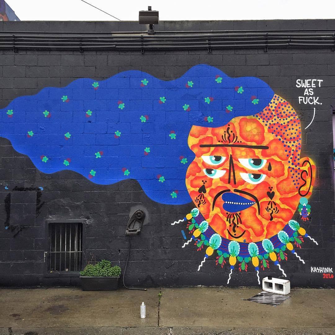 En 2015, année de création de LE CARTEL, KASHINK collabore avec la marque pour la première fois en développant une fresque à Montréal, qui est toujours iconique. Cette synergie se renouvelle en 2024 lors de l'inauguration de la première boutique parisienne et de l'exposition collective sur textile "Paris est une fête".