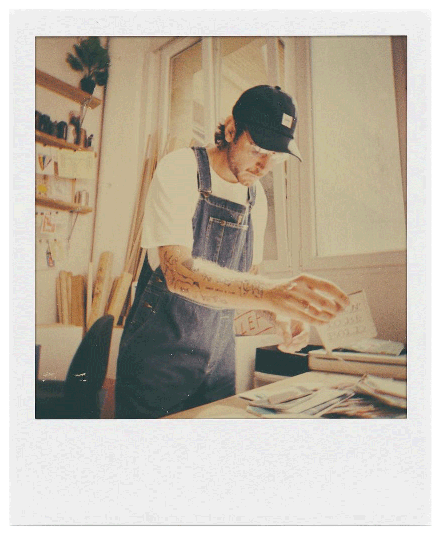 Jonglant entre différentes pratiques et différents supports (de la peinture murale à la peau en passant par le papier ou la toile) il mêle son travail personnel à des projets de commandes répondant à des problématiques d’identités ou d’illustrations pour des clients variés : Agences de communication, Magazines, Associations, Petites et grandes entreprises, marques de vêtements et autres. Sans oublier les différents ateliers qu’il réalise auprès d’enfants et d’adultes, construisant des projets alliant micro-narration et travail collectif - afin de développer leurs esprits de synthèses.